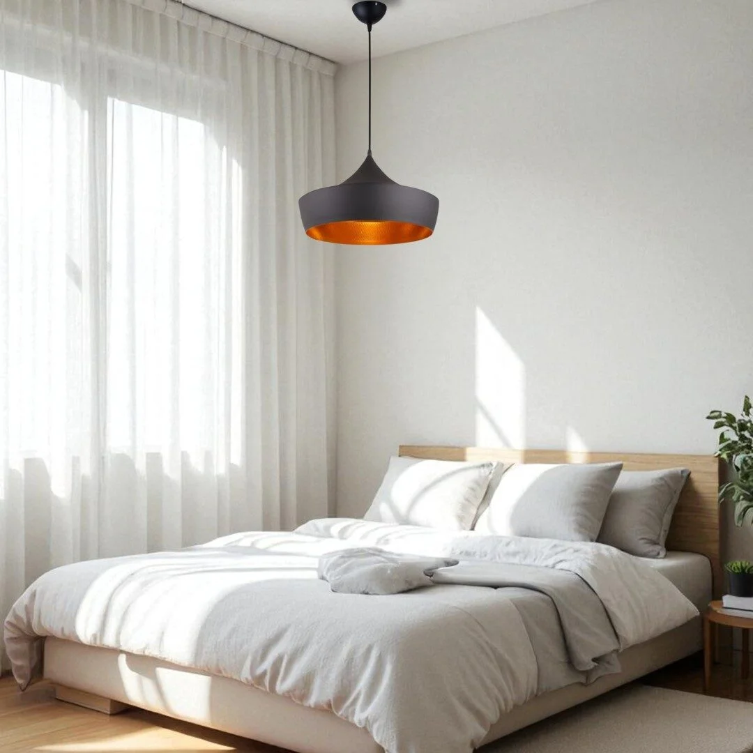 Aluminium Hanglamp Tischka Zwart en Goud – Tijdloze Luxe voor Elk InterieurDe Aluminium Hanglamp Tischka Zwart en Goud combineert verfijnd design met functionele verlichting. Met haar brede, afgeronde kap en een warme, goudkleurige binnenkant creëert deze lamp een elegante en sfeervolle uitstraling. Perfect voor boven de eettafel, in de woonkamer of in een stijlvolle keuken.Waarom kiezen voor de Tischka hanglamp?