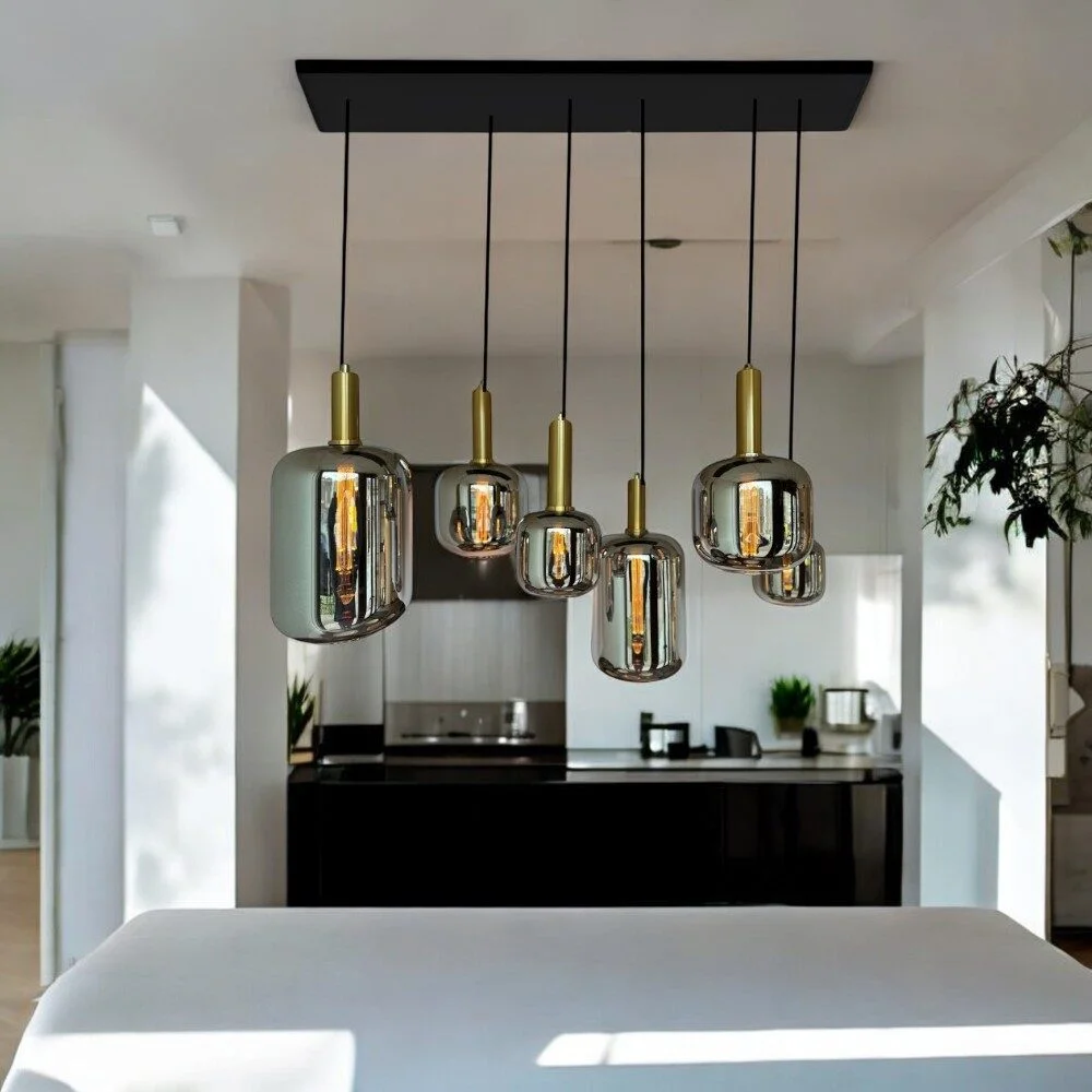 De design glazen hanglamp Queen goud met smoke glas 6-lichts is dé perfecte keuze voor wie op zoek is naar een eyecatcher in huis. Het stijlvolle rookglas in combinatie met de goudkleurige afwerking straalt luxe en elegantie uit. Deze lamp past moeiteloos in verschillende interieurstijlen, van modern tot industrieel, en voegt direct sfeer toe aan iedere ruimte.