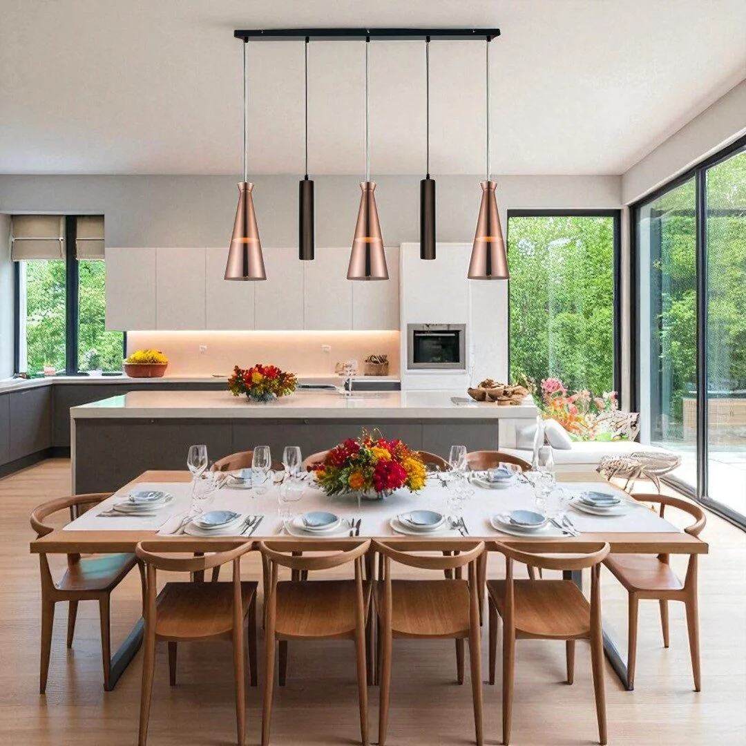 Samen vormen ze een perfect evenwichtige compositie op een rechte plafondplaat van100 cm – ideaal boven een langwerpige eettafel of keukeneiland.